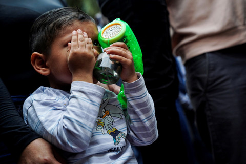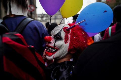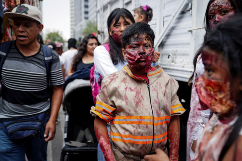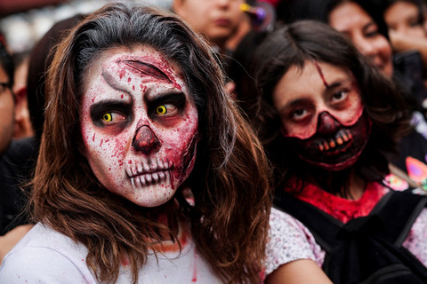 Warga yang mengenakan kostum zombie turun ke jalanan kota Meksiko pada Sabtu (18/10) untuk meramaikan Zombie Walk tahunan. Kostum dan riasan detail membuat pemandangan kota seakan menjadi seram.
